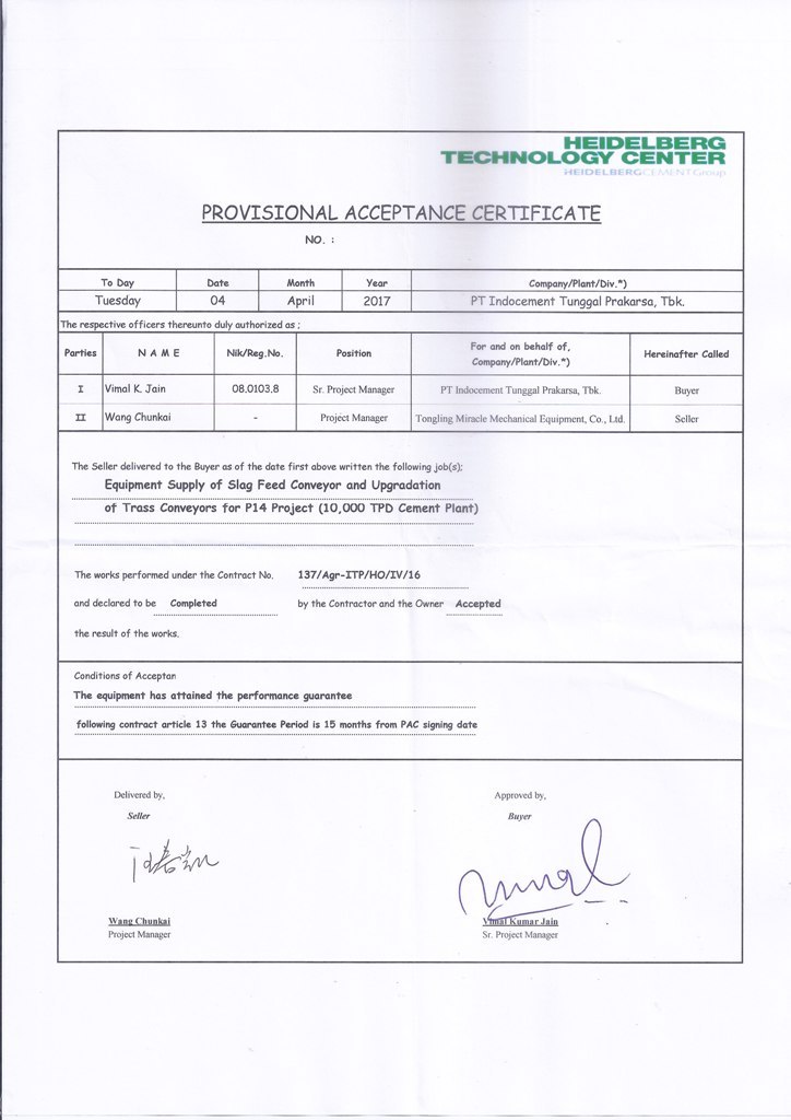 2017年4月在印尼PT Indocement Tunggal Prakarsa, Tbk項(xiàng)目的現(xiàn)場(chǎng)成功試車運(yùn)行并且得到業(yè)主方的認(rèn)可。與同年5月,我公司收到了業(yè)主方和安裝方現(xiàn)場(chǎng)簽署的現(xiàn)場(chǎng)合格驗(yàn)收證明,證明我公司供貨的皮帶機(jī)設(shè)備各方面性能運(yùn)行良好。